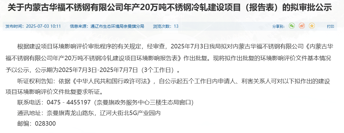 2025年7月3日,通遼市生態(tài)環(huán)境局奈曼旗分局就內(nèi)蒙古華福不銹鋼有限公司年產(chǎn)20萬噸不銹鋼冷軋建設項目環(huán)境影響評價報告表作出審批意見并對外進行公示,公示期為2025年7月3日-2025年7月7日(3個工作日)。