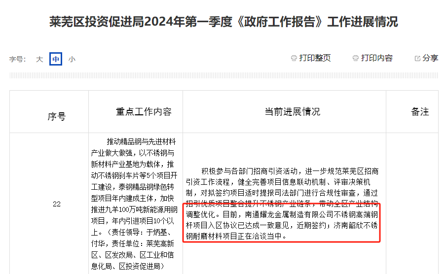 4月30日,據萊蕪區投資促進局2024年第一季度《政府工作報告》工作進展情況顯示,“目前,南通耀龍金屬制造有限公司不銹鋼高端鋼桿項目入區協議已達成一致意見,近期簽約;濟南韶欣不銹鋼耐磨材料項目正在洽談當中。”